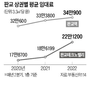 부동산R114에 따르면 판교테크노밸리 상권의 평균 임대료(1층 기준)는 올 2분기 3.3㎡당 22만1200원으로 집계됐습니다. 이는 코로나19 사태가 본격화한 2020년 2분기 3.3㎡당 17만8700원보다 23%가량 높습니다. 판교역 상권 임대료도 같은 기간 3.3㎡당 32만600원에서 34만900원으로 상승했습니다.